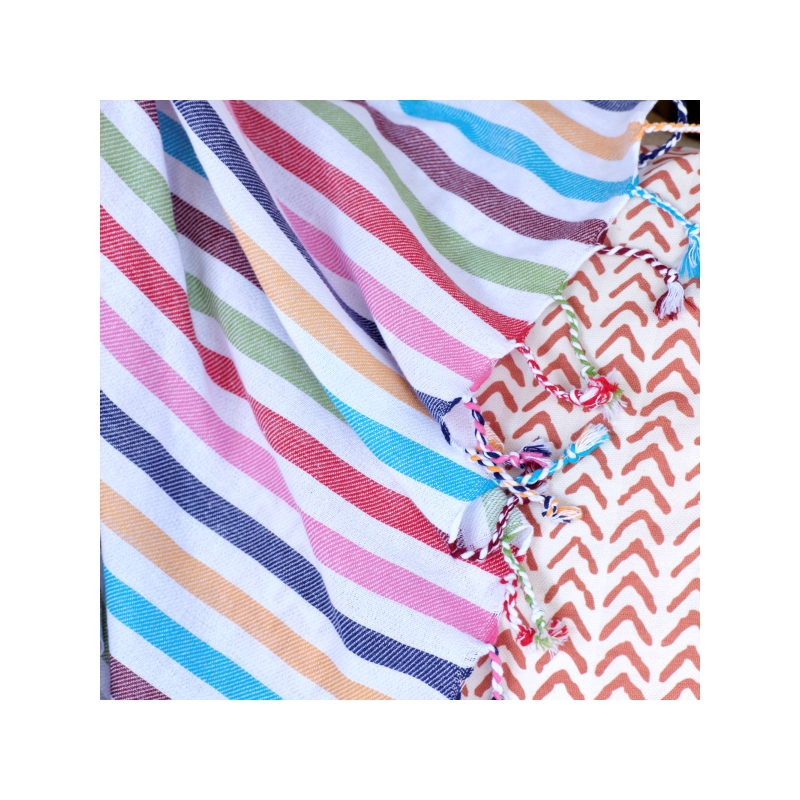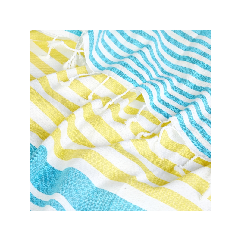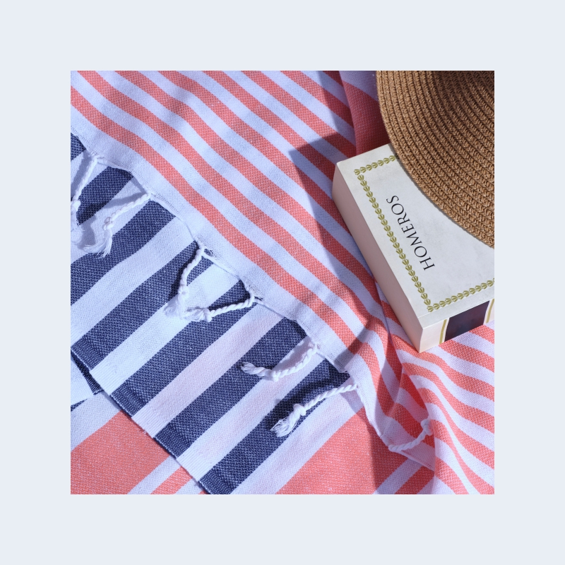 On the other hand, there are Fouta with similar uses and structure of peshtemal from the south of the Mediterranean. The fouta (also spelled futa) is a piece of thin patterned cotton or linen fabric of Tunisian origin used in many Mediterranean countries and Yemen.Among other uses, they were worn, by both men and women, wrapped around the body while at the public baths in 19th-century Syria.In Algeria, conservative women wore the fouta draped over their sarouel garment.Similarly, in some parts of southern Saudi Arabia, men would wear the fouta as a loincloth beneath their thawb robes, or just by itself while relaxing at home.Foutas are widely used today in the occidental world as Turkish bath towels (hammam towels) or even beach towels.
